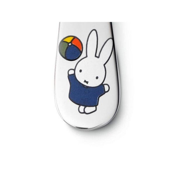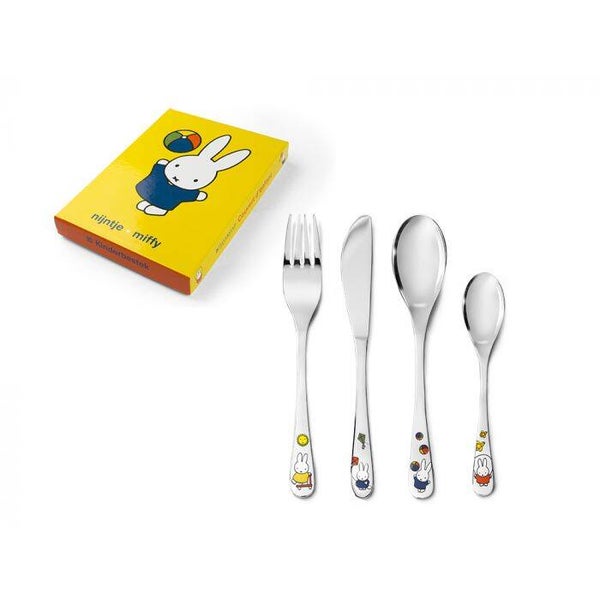 Op deze 4-delige bestekset staat een spelende nijntje in kleur afgebeeld.