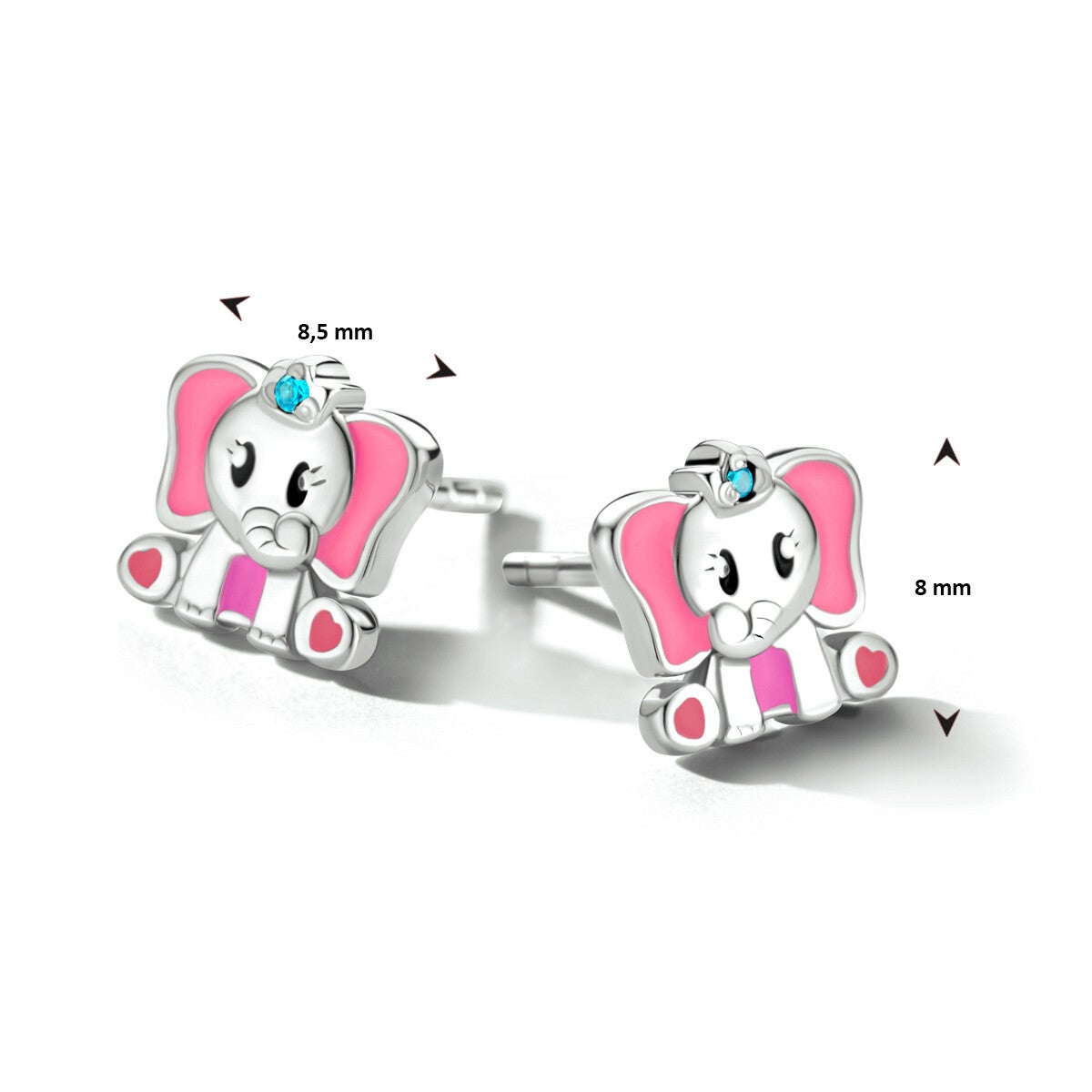 Gerhodineerd 925 zilveren oorknoppen uitgevoerd in de vorm van een olifant. Roze emaille en met een blauwe zirkonia.