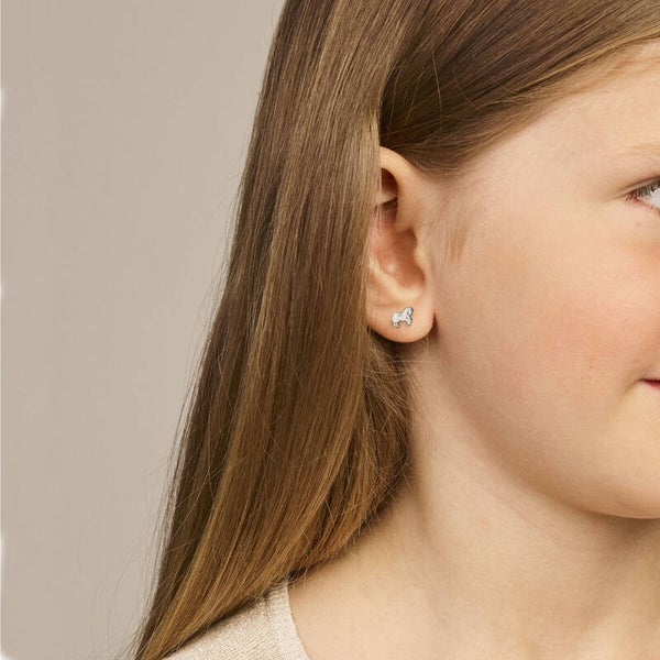 Zilveren gerhodineerde oorknoppen in de vorm van paardjes.