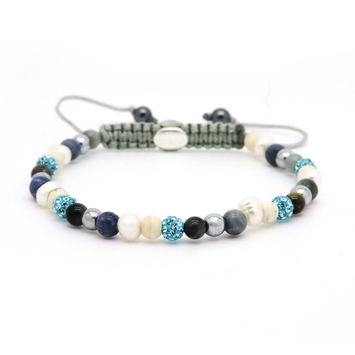 Deze echte edelstenen armband met blauw crystal van Karma is op verschillende lengtes draagbaar.