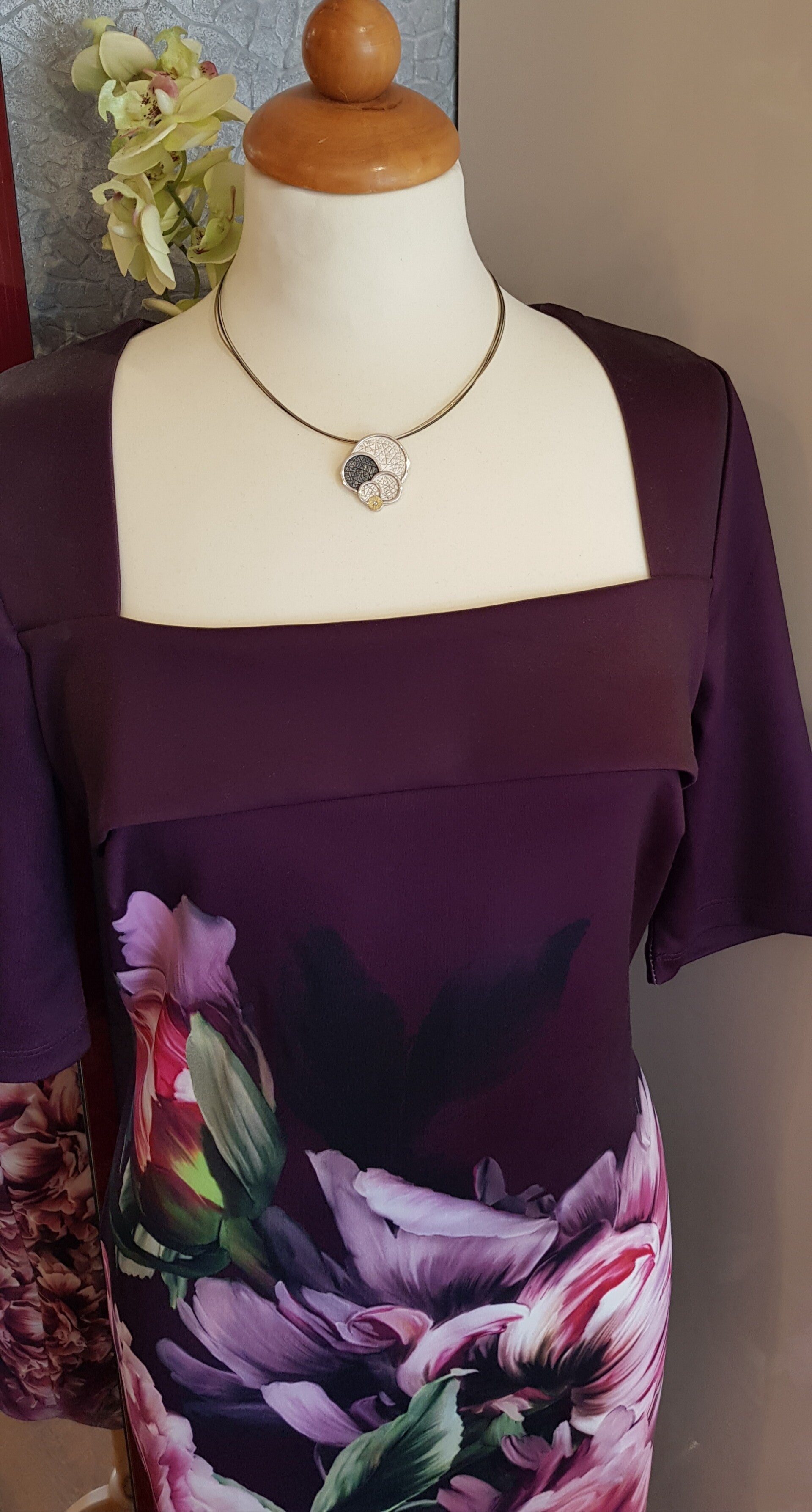 Deze hanger hangt aan een collier gecombineerd met staal en zilver met een zilver slot met een draaglengte van 42cm.