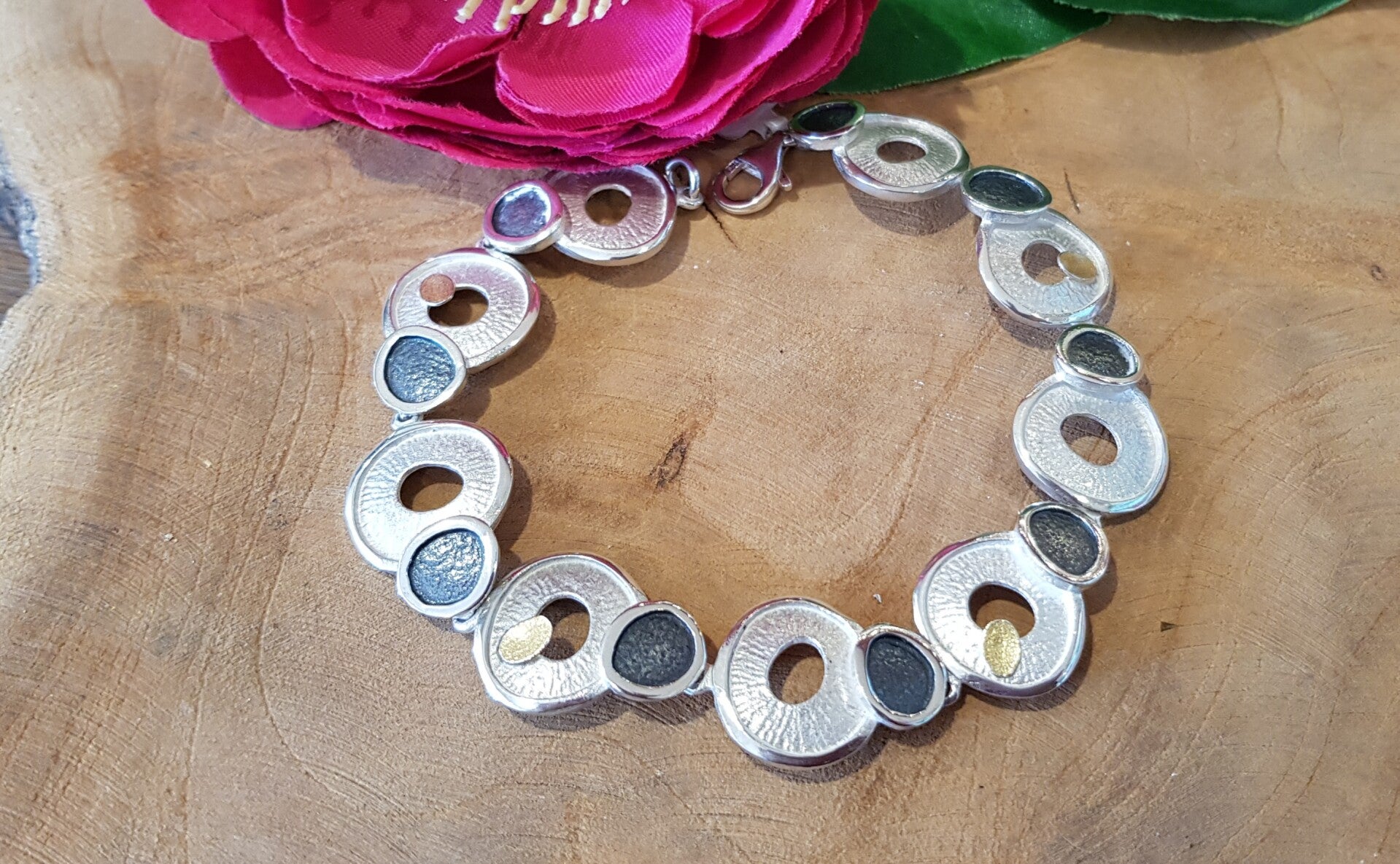 Deze zilveren armband is speels door de verschillende structuren en de contrast die ontstaat door het geoxideerde zilver in combinatie met 18 karaat goud.