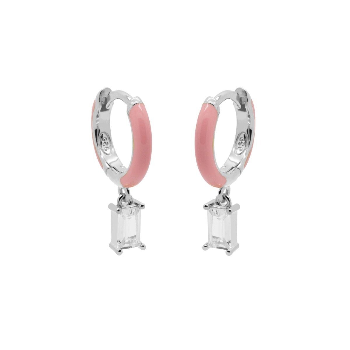 Klapooringen zilver met roze emaille en baquet geslepen zirkonia hanger