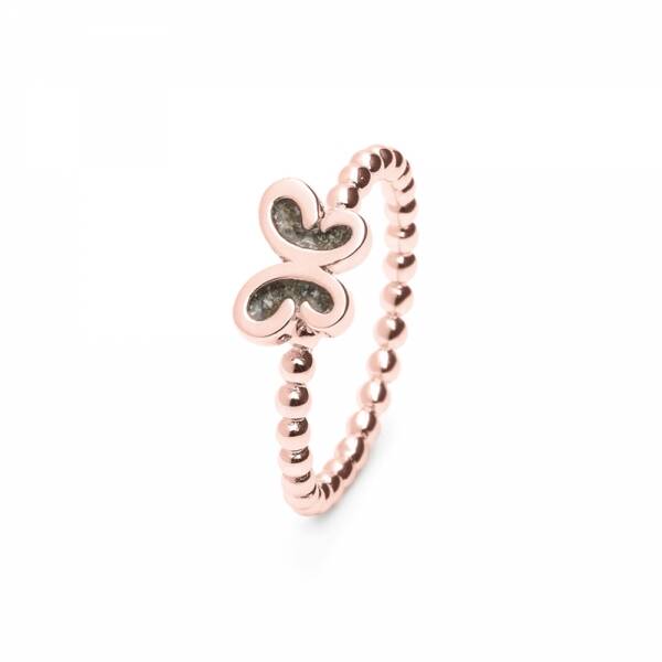 Zilveren ring, vlinder. Dit sieraad wordt zichtbaar aan de voorkant gevuld met as en wordt vermengd met onze speciale hars. Deze ring wordt ook wel gebruikt als aanschuif ring. Doordat het hartje bovenop de scheen ligt, kan hij makkelijk bij een andere ring aangeschoven worden.