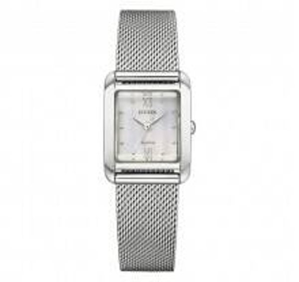 Dit Citizen Eco drive horloge van edelstaal uit de citizen L collectie heeft een blauw parelmoer wijzerplaat met een kastgrootte van 21,5 mm x 28,4 mm van 32,5mm. Met een milanese band en een extra gratis blauwe ecopet band om zelf te kunnen wisselen