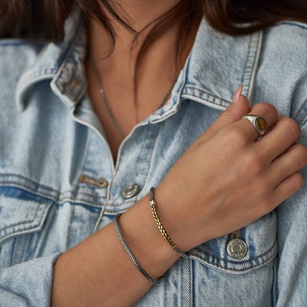 Nieuwkomer in de mini hookserie is deze prachtige handgevlochten bicolor armband. Ben jij gek op de mini hook series en combineer je graag zilver met goudkleurige sieraden? Ontdek dan nú de 650SBR uit de Chevron serie van Silk Jewellery het nieuwste bicolor armbandje met mini karabijn haakje, welke zilver combineert met messing!