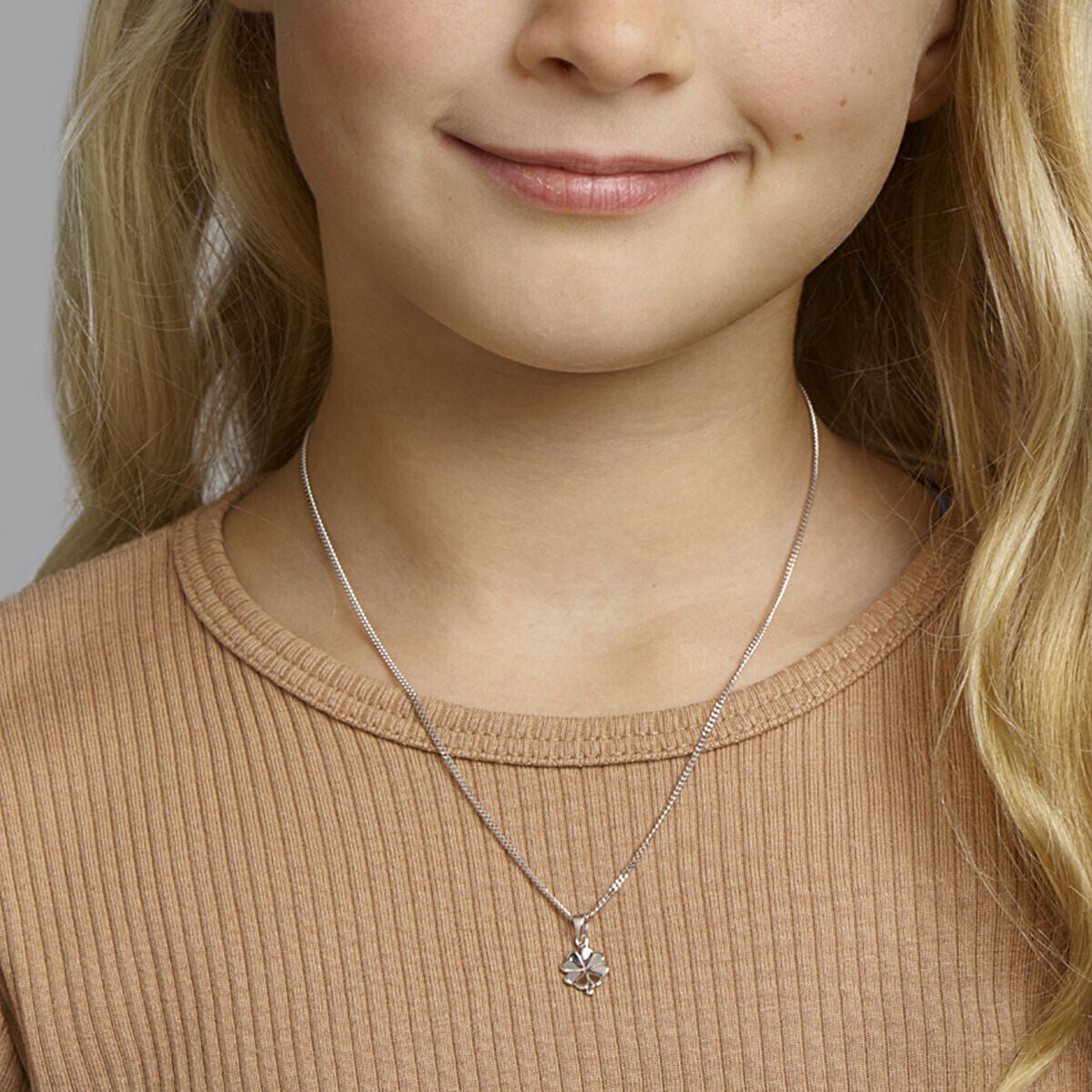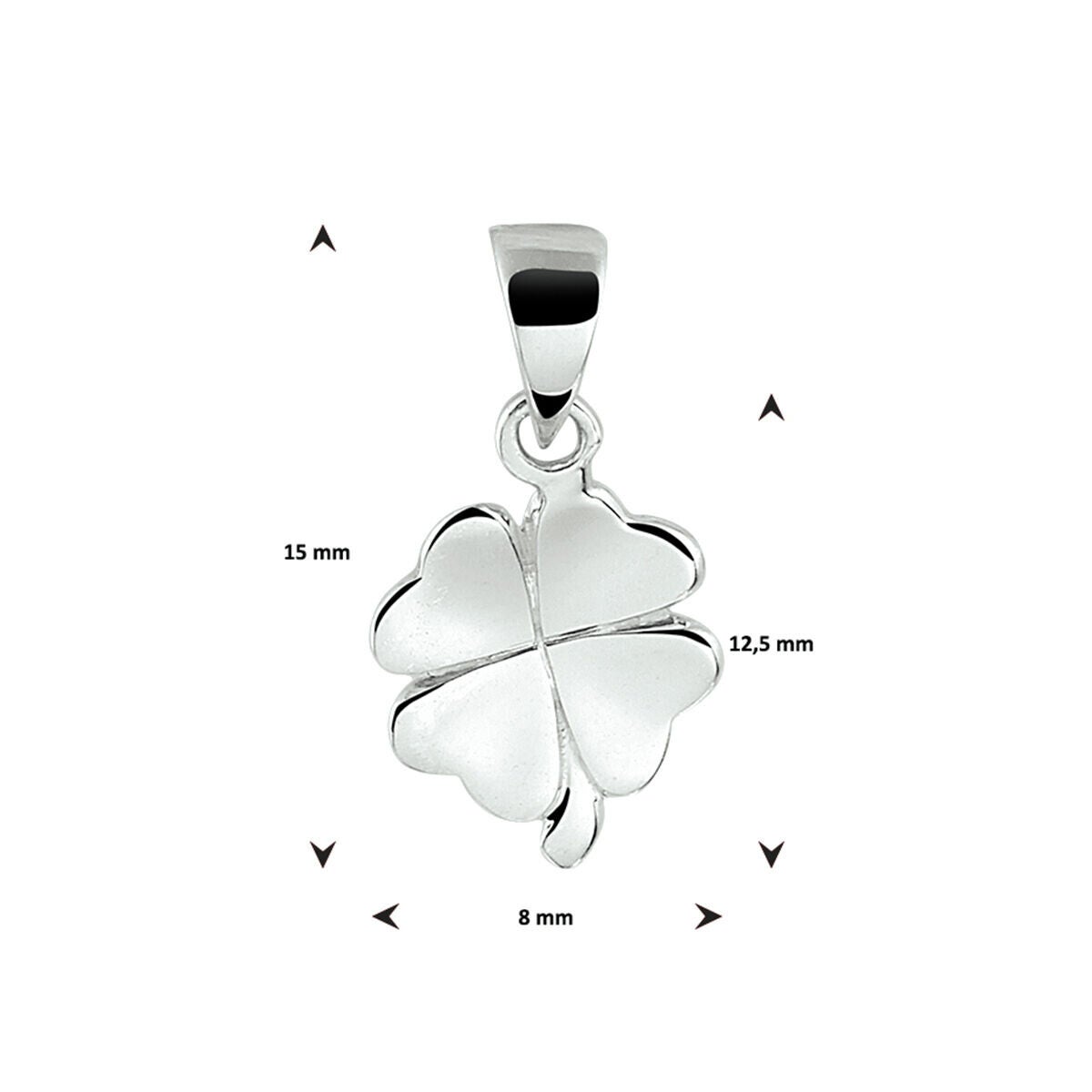 Gerhodineerd 925 zilveren hanger in de vorm van een klavertje. De hanger heeft een totale hoogte van 1.5cm. De hanger heeft een afmeting van 12.5x8mm.