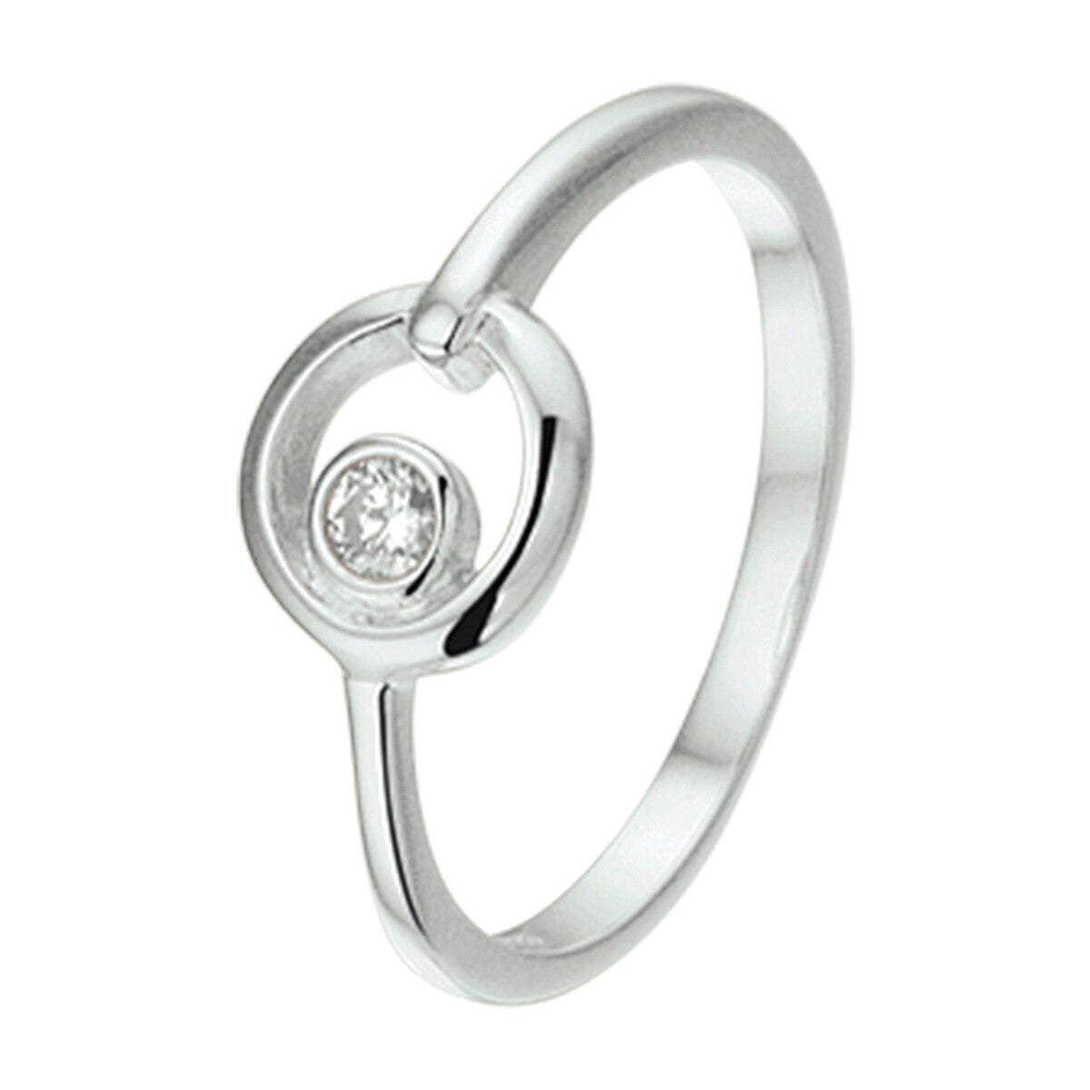 Zilveren ring waarbij een cirkel ontwerp de zirconia omringd.