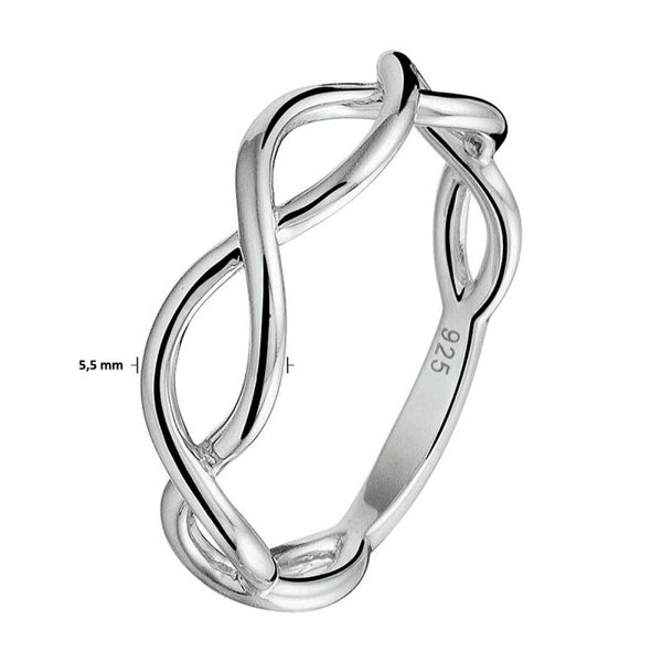 Een elegante zilveren ring waarbij de twee kanten kruisende golfjes maken voor een stijlvol ontwerp.