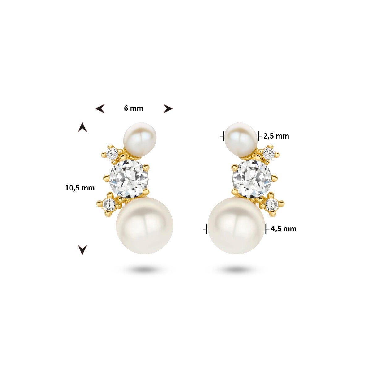 14k Geelgouden oorknoppen uitgevoerd met zirkonia en zoetwaterparels van 2.5mm en 4.5mm. De oorknoppen hebben een afmeting van 10.5x6mm.
