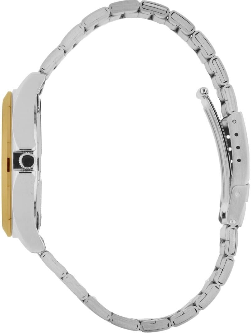 Herenhorloge van Olympic met stalen band en kast met blauwe wijzerplaat en goudkleurige streepjes. Met datumaanduiding.